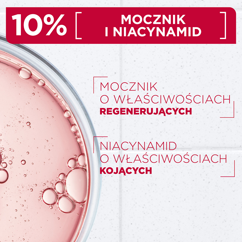 • Mocznik to najważniejszy składnik kosmetyku. Jest znany ze swoich właściwości zmiękczających, nawilżających i antyseptycznych. Przenika on przed warstwę rogową naskórka i wzmacnia barierę ochronną skóry.