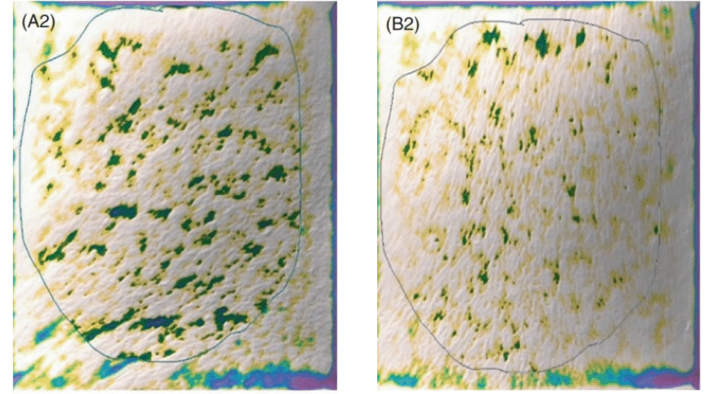 • Pomiar topografii skóry – często wykorzystywaną aparaturą do pomiaru topografii skóry jest urządzenie Antera 3D. Jest to nowoczesny system obrazowania, który pozwala na wykorzystanie skanowania trójwymiarowego oraz spektrofotometrii, w celu analizy strukturalnej skóry. Pozwala na sporządzenie trójwymiarowej mapy powierzchni skóry, co umożliwia dokładną analizę nierówności, które są charakterystyczne dla cellulitu. Na Zdjęciu 1 przedstawiono porównanie objętości zagłębień skóry przed (A1) i po 2 miesiącach miejscowego stosowania produktu antycellulitowego (B1).
