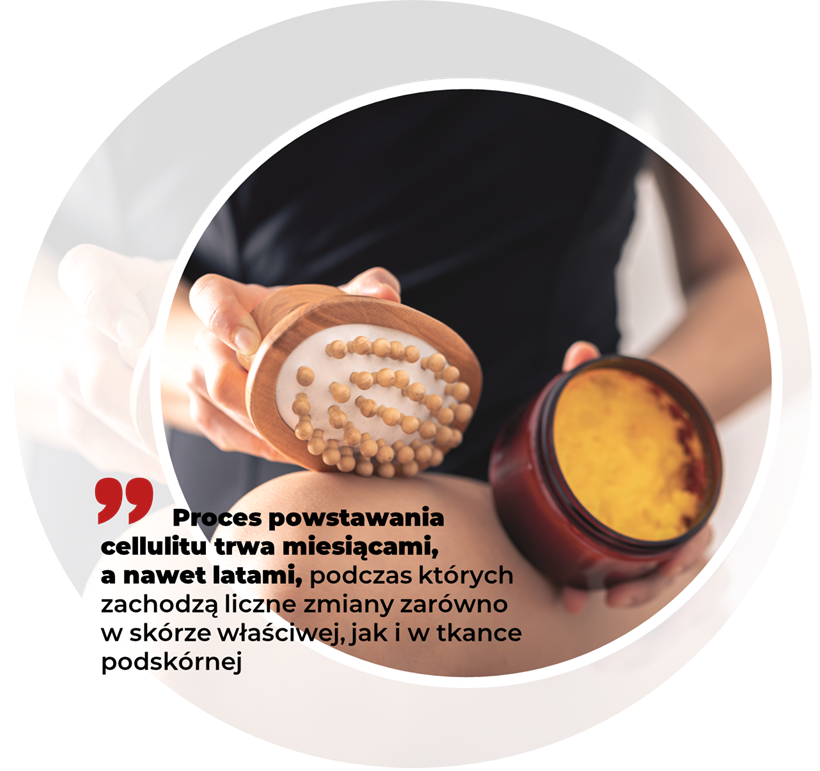 Lipostrofia typu kobiecego, inaczej nazywana cellulitem, stanowi jeden z najpowszechniejszych problemów estetyczno-medycznych dotykających ponad 85% kobiet. Cellulit to nierównomiernie rozłożona tkanka tłuszczowa, która najczęściej pojawia się na bocznej i tylnej części ud, brzuchu i pośladkach. Charakteryzuje się widocznymi zagłębieniami i nierównościami na skórze, przypominając strukturę skórki pomarańczy [1-2]. Przyczyny powstawania cellulitu są skomplikowane i wynikają z wielu czynników. Kluczową rolę odgrywają zaburzenia mikrokrążenia, zwiększona przepuszczalność naczyń krwionośnych i limfatycznych oraz zmiany w metabolizmie komórek tłuszczowych. Istotny wpływ mają także zaburzenia hormonalne, skłonności genetyczne oraz brak ruchu i niezdrowe przyzwyczajenia żywieniowe. U mężczyzn cellulit występuje znacznie rzadziej (ok. 2% przypadków) i może być związany z nieprawidłowym funkcjonowaniem hormonów androgenowych lub terapią hormonalną stosowaną w leczeniu raka prostaty [1, 3].