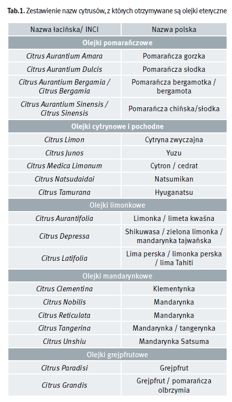 Cytrusami określamy rośliny należące do rodziny rutowatych z rodzaju Citrus L. Na rynku kosmetycznym dostępne są m.in. olejki z różnych gatunków pomarańczy, cytryn, limonek, mandarynek i grejpfrutów. Ponadto mogą być one otrzymywane z wielu odmiennych części roślin, takich jak: owoce (miąższ), skórka, liście, kwiaty. W dniu pisania artykułu (17.04.2024 r.) w bazie Cosing obecne są aż 123 nazwy INCI olejków eterycznych uzyskiwanych z cytrusów. Tabela 1 zawiera łacińskie (INCI) i polskie nazwy gatunków cytrusów wykorzystywanych do produkcji olejków eterycznych. Ta ogromna różnorodność sprawia, że cytrusowe olejki wykazują niejednokrotnie odmienne właściwości, również w zakresie toksykologii i bezpieczeństwa. W artykule dokonano przeglądu obecnie stosowanych w kosmetyce cytrusowych olejków eterycznych wraz z wybranymi aspektami ich bezpieczeństwa.