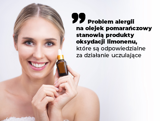 Jednym z najbardziej popularnych olejków w tej grupie jest olejek ze słodkiej pomarańczy (nazwa zamienna: pomarańcza chińska), Citrus aurantium L. var. dulcis L. (syn: Citrus sinensis), Rutaceae. Znajdziemy go pod różnymi nazwami INCI, m.in.: Citrus Aurantium Dulcis Oil, Citrus Aurantium Dulcis Peel Oil, Citrus Aurantium Dulcis Peel Oil Expressed, Citrus Sinensis Peel Oil, Citrus Aurantium Dulcis Flower Oil. Oczywistym jest, że olejek ze skórki owoców będzie miał odmienny skład niż olejek z kwiatów czy liści. Kluczowe substancje występujące w olejku z owoców pomarańczy słodkiej to: (+)-limonen, β-myrcen, α-pinen, linalol, geranial. Dla olejku z kwiatów (olejek neroli) będą to: 2-fenyletanol, linalol, octan linalilu i antranilan metylu, natomiast dla olejku z liści (olejek petitgrain): octan linalilu, linalol oraz myrcen. W niniejszym artykule skupimy się na olejkach otrzymywanych z owoców, ponieważ w samej tej grupie mamy bardzo dużą różnorodność. Przykładowo, Citrus Aurantium Dulcis Peel Oil to olejek eteryczny otrzymywany ze skórki owoców, Citrus Aurantium Dulcis Peel Oil Expressed jest wytłaczany ze świeżego epikarpu, natomiast Citrus Aurantium Dulcis Oil pozyskuje się z różnych części pomarańczy słodkiej. W olejku ze skórki dominującymi składnikami będą: (+)-limonen, β-myrcene, α-pinen, linalool, geranial, natomiast w olejku z epikarpu: D-limonen (do 90%), dekanaldehyd, antranilan metylu, linalol i terpineol. Generalnie olejki ze słodkiej pomarańczy cechują się bardzo korzystnym profilem toksykologicznym. Wykazują niską toksyczność po podaniu dermalnym i doustnym, a także umiarkowane działanie drażniące na skórę i oczy. Chociaż główny składnik tych olejków – limonen, jest znanym alergenem, to wyniki licznych badań przeprowadzonych na ochotnikach sugerują, że nieutleniony olejek pomarańczowy nie jest uczulający.