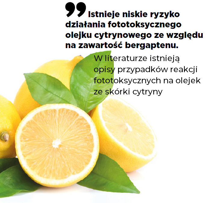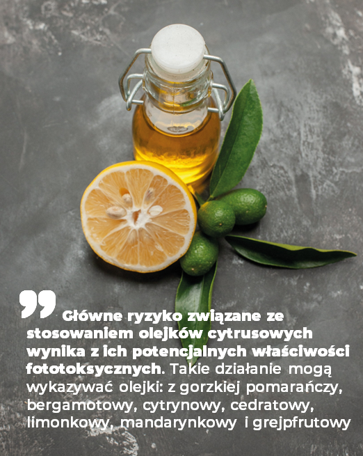 Podsumowując, cytrusowe olejki eteryczne są surowcami kosmetycznymi otrzymywanymi z różnych gatunków cytrusów, w tym: pomarańczy, cytryn, limonek, mandarynek i grejpfrutów. Stanowią cenne składniki nie tylko ze względu na swoje walory zapachowe, ale także z uwagi na wielokierunkowe działanie na skórę, takie jak antyoksydacyjne, rozjaśniające i antycellulitowe. Generalnie są to substancje o niskiej toksyczności, a większość z nich posiada status GRAS. Ich działanie alergizujące jest związane przede wszystkim z utlenianiem głównego składnika – limonenu, natomiast większość olejków cytrusowych w postaci nieutlenionej nie uczula. Główne ryzyko związane ze stosowaniem tych olejków wynika z ich potencjalnych właściwości fototoksycznych. Takie działanie mogą wykazywać olejki: z gorzkiej pomarańczy, bergamotowy, cytrynowy, cedratowy, limonkowy, mandarynkowy i grejpfrutowy. Dlatego korzystając z produktów kosmetycznych zawierających te olejki należy chronić skórę przed nadmierną ekspozycją na promieniowanie UV i stosować ochronę przeciwsłoneczną.