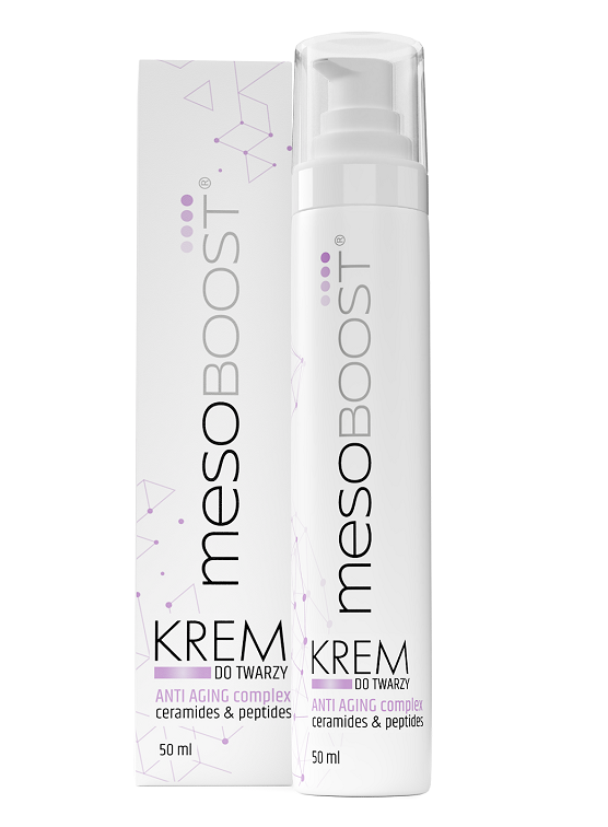 Krem do twarzy mesoBoost® ANTI AGING complex ceramides & peptides to kombinacja składników aktywnych o działaniu anti-age. Ceramidy wzmacniają barierę ochronną skóry, chronią przed odwodnieniem i przesuszeniem, a także wykazują działanie przeciwzmarszczkowe i ujędrniające. Peptydy z kolei promują aktywację procesu regeneracji i korzystnie wpływają na odmłodzenie skóry.