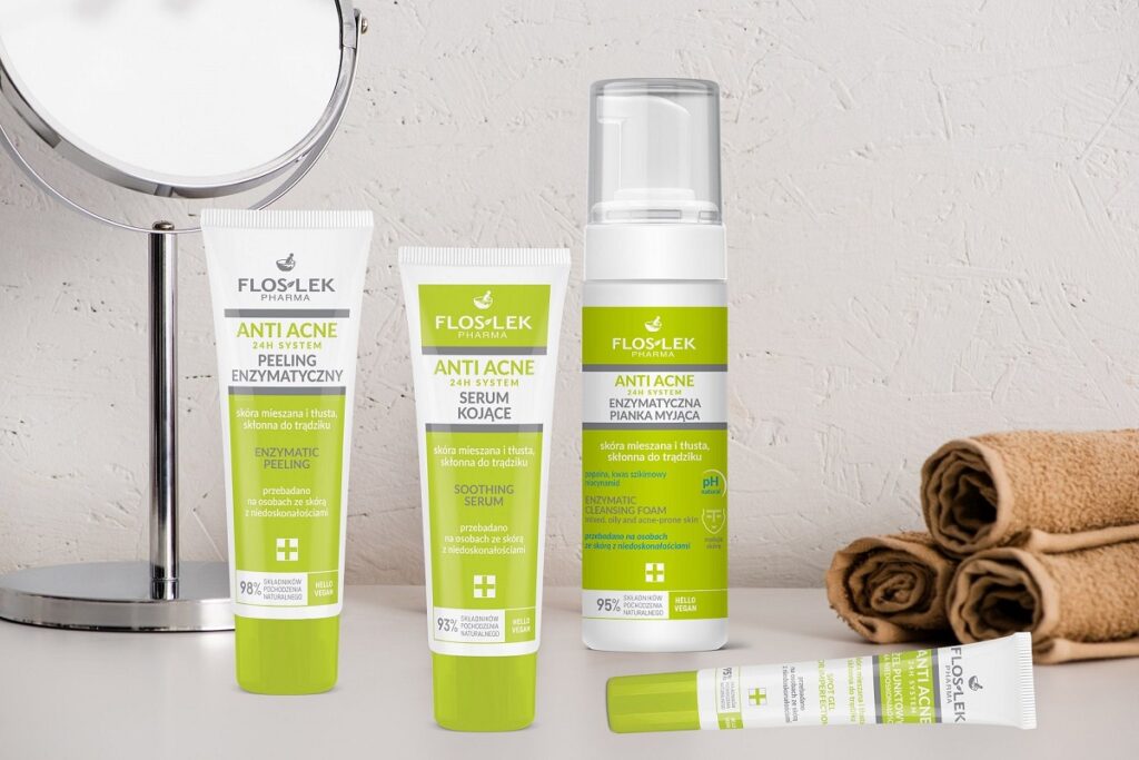 - Oczyszczanie: codzienne oczyszczanie skóry jest kluczowe. Używaj łagodnych żeli lub pianek oczyszczających, które nie będą zbytnio wysuszać skóry. Unikaj natomiast agresywnych środków, które mogą pogorszyć jej stan. Idealnymi preparatami są te z linii ANTI-ACNE 24 marki FLOSLEK Laboratorium: