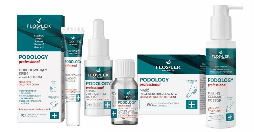 - Zabiegi złuszczające: po 15-20 minutach moczenia stóp warto użyć preparatu PODOLOGY Professional Peeling gommage do stóp (sugerowana cena 60 zł / pojemność 100ml) marki FLOSLEK Pharma. Stanowi świetną alternatywę dla pumeksów i tarek, których stosowanie sprzyja przyspieszonemu rogowaceniu naskórka. Delikatnie, ale skutecznie złuszcza naskórek, zmniejsza odczucie szorstkości i pozostawia skórę jedwabiście gładką. Preparat zawiera kwasy owocowe, ekstrakt z oczaru wirginijskiego oraz kompleks nawilżający.