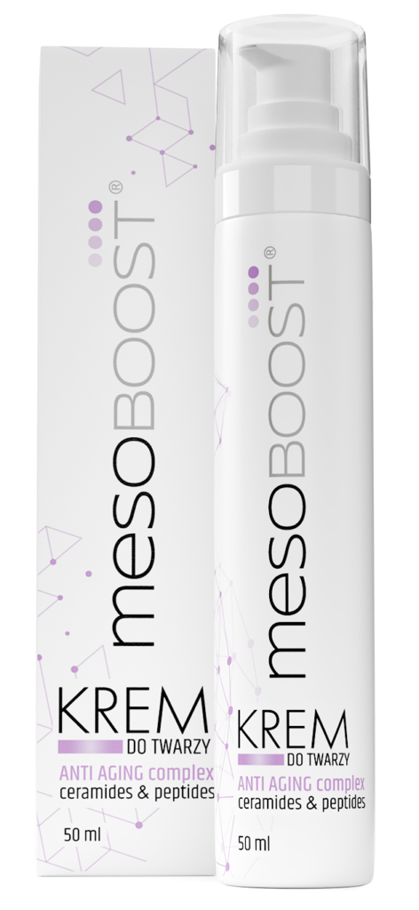 Krem do twarzy mesoBoost® ANTI AGING complex ceramides & peptides to kombinacja składników aktywnych o działaniu anti-age. Ceramidy wzmacniają barierę ochronną skóry, chronią przed odwodnieniem i przesuszeniem, a także wykazują działanie przeciwzmarszczkowe i ujędrniające. Peptydy z kolei promują aktywację procesu regeneracji i korzystnie wpływają na odmłodzenie skóry.