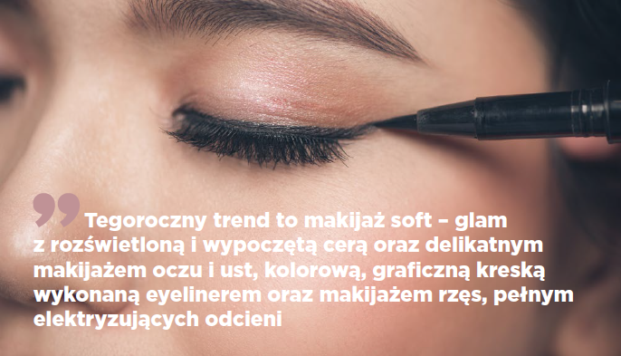 Do niedawna na topie była subtelna kreska eyelinerem, która wizualnie zagęszczała rzęsy i podkreślała kształt oka, o tyle w 2024 roku stawiamy na jej bardziej rozbudowaną wersję. Dlatego należy poeksperymentować z jej grubością, a także z długością jaskółki. Oprócz tego trendy makijażowe zachęcają, by tworzyć bardziej wyraziste, graficzne kształty oraz nie ograniczać się wyłącznie do czarnej kreski. Wobec czego coraz chętniej są wybierane kolorowe eyelinery. Przykładowo w makijażu na imprezę można wykorzystać neonowe eyelinery, łącząc różne odcienie i wykonując najbardziej fantazyjne warianty kresek. Rysując kreskę, nie powinno sięgać się po kredkę, która nadaje make-upowi nieco łagodniejszy, bardziej miękki charakter.