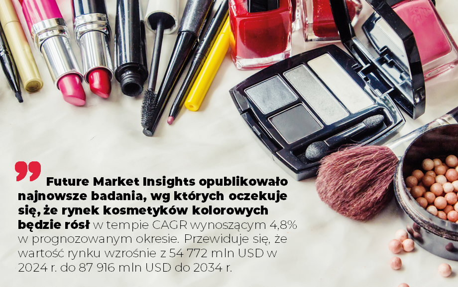 Wpływ mediów społecznościowych i rekomendacji ze strony influencerów jest silniejszy i coraz bardziej zachęcający do zakupu produktów kolorowych. Tegoroczny trend to makijaż soft – glam z rozświetloną i wypoczętą cerą oraz delikatnym makijażem oczu i ust, kolorową, graficzną kreską wykonaną eyelinerem oraz makijażem rzęs, pełnym elektryzujących odcieni. Konsumenci są za zmniejszeniem ilości opakowań, korzystając chętnie z opakowań wielokrotnego użytku. Głównym czynnikiem determinującym zakup kosmetyku jest materiał z którego jest wykonany oraz kształt i kolor opakowania. W roku 2024 konsumenci chętnie sięgają po kosmetyki kolorowe o działaniu nawilżającym, pielęgnującym skórę oraz absorbującym promieniowanie UV.