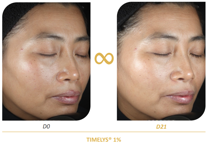 Wspomniane bogactwo długowieczności zostało zamknięte w najnowszym surowcu firmy Greentech – TIMELYS®. Substancja aktywna działa na mechanizmy takie jak ekspresja genów długowieczności i autofagów, zwiększenie aktywności mitochondriów, redukcja stresu oksydacyjnego, zwiększenie żywotności skóry, a także poprawa jej integralności. W przeprowadzonych badaniach wykazano wzmocnienie bariery skórnej TEWL o 24% po 7 dniach, poprawę mikro cyrkulacji o 33% po 14 dniach oraz zwiększenie poziomu nawilżenia skóry o 24% po 14 dniach. Ponadto wykazano, że po 21 dniach stosowania, skóra stała się o 47% bardziej promienna w porównaniu z próbą kontrolną (fot. 2). TIMELYS® sprawia, że skóra odzyskuje zdrowy, promienny wygląd.