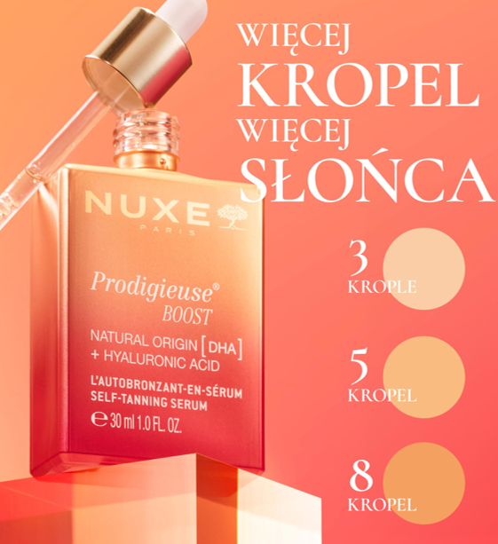 Zapomnij o nierównomiernej aplikacji i nieprzyjemnym zapachu, który kojarzył się dotąd z samoopalaczami. Nowe serum brązujące od NUXE w jednej chwili nawilża, wypełnia skórę i stopniowo nadaje jej naturalny, złocisty odcień. Dzięki tej nowoczesnej formule możesz cieszyć się wakacyjnym glow przez cały rok, bez konieczności wystawiania skóry na szkodliwe działanie promieni UV. To luksusowa, naturalna i w pełni kontrolowana opalenizna – kropla po kropli.