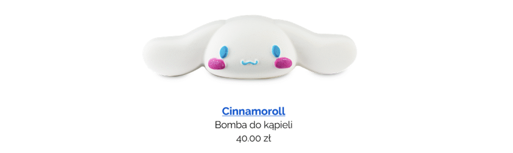 Cinnamoroll barwi wodę na piękny błękitny kolor, a w powietrzu unosi się słodki, otulający zapach. Zawarty w produkcie olejek migdałowy nadaje kąpieli lekko owocowy aromat, a absolut z wanilii wprowadza słodką, deserową nutę. Całość dopełnia olejek z liści cynamonu, który przywołuje zapach świeżo upieczonych cynamonek.