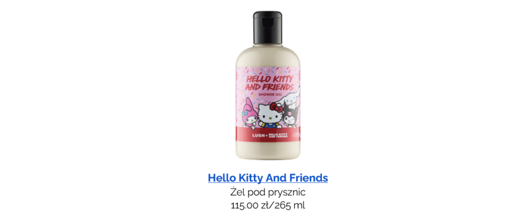 To właśnie na tę współpracę czekała społeczność marki Lush. Hello Kitty była jedną z najczęściej zgłaszanych przez pracowników i klientów propozycji, kiedy pytano o wymarzone współprace. Cztery bomby do kąpieli, jedna kostka bąbelkowa, mydło, perfumy i żel pod prysznic stworzyły uroczą, różową kolekcję, która łączy zabawę, zapachy i przyjaźń. Bo z przyjaciółmi wszystko smakuje lepiej – nawet kąpiel!