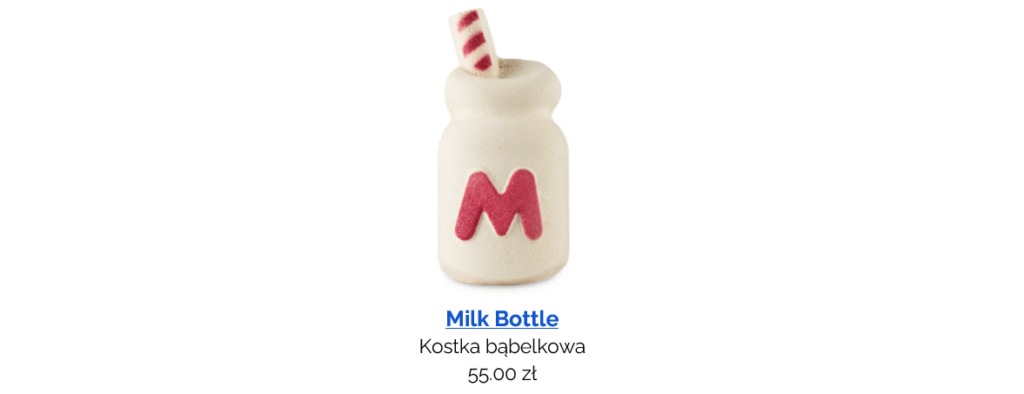 Kultową butelkę mleka Hello Kitty, Lush serwuje pod postacią kostki bąbelkowej. Wystarczy dać kawałek pod bieżącą wodę, by cieszyć się wanną pełną bąbelków. Zapach słodkiego olejku migdałowego i absolutu kakaowego przywodzi na myśl czekoladowego shake’a.