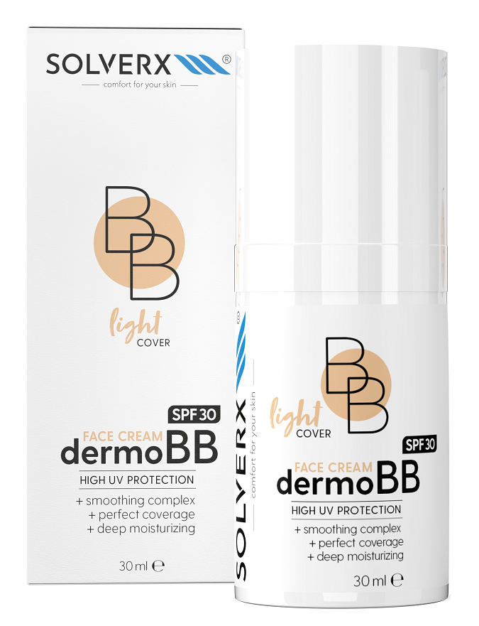 SOLVERX® dermoBB SPF 30 to lekki dermokosmetyk tonujący odcień skóry. Doskonale wtapia się w skórę kryjąc niedoskonałości i tworząc naturalne, aksamitne wykończenie.