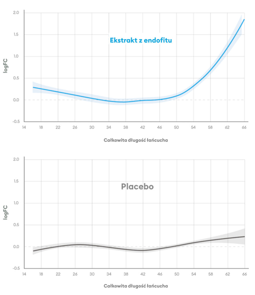 Ferment z endofitu Kwoniella mangroviensis (KMFE) został przebadany pod kątem wpływu na profil lipidowy skóry. Wykorzystano do tego celu innowacyjną analizę lipidomu, która pozwala na ocenę w warunkach in-vivo wszystkich lipidów tworzących barierę skórną. Badanie z podwójnie ślepą próbą wykonano na 60 ochotniczkach w wieku 45–65 lat, które przez 56 dni na jedną połowę twarzy aplikowały produkt placebo, a na drugą produkt z zawartością 2% KMFE. W 240 przeanalizowanych próbkach zidentyfikowano 328 lipidów i zaobserwowano, że stosowanie KMFE wywołało istotną zmianę poziomu 114 lipidów, w porównaniu z placebo. Przeprowadzono też dalszą analizę bioinformatyczną tych lipidów, wykazując, że KMFE ograniczył poziom ich oksydacji nawet o 32%. Ochrona lipidów bariery skórnej przed utlenianiem potencjalnie przyczyniła się także do wydłużenia ich łańcuchów węglowych. KMFE wpłynął w tym obszarze na 55 różnych trójglicerydów oraz 31 ceramidów endogennych, zwiększając długość ich łańcuchów węglowych (rys. 2). KMFE moduluje zatem profil endogennego lipidomu w kierunku lipidów o dłuższych łańcuchach, poprawiając w ten sposób funkcję ochronną bariery skórnej, sprzyjając zatrzymywaniu wody oraz poprawiając elastyczność i jędrność skóry.