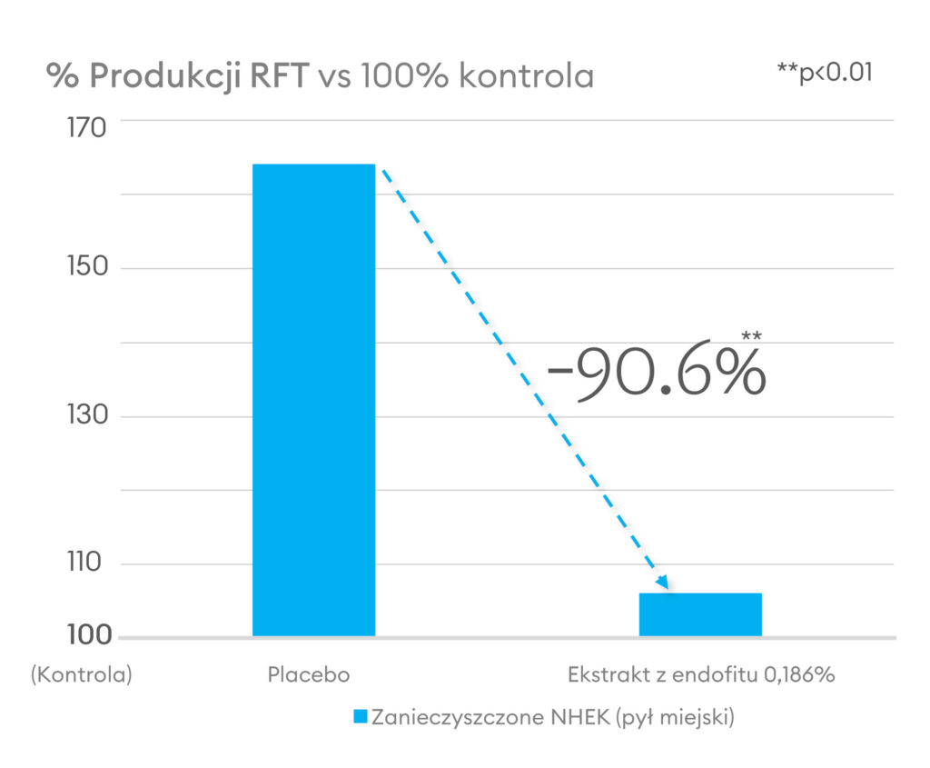W obliczu rosnących wyzwań środowiskowych i codziennego zagrożenia zanieczyszczeniami, holistyczne podejście do bariery skórnej i kompleksowej ochrony powinno także uwzględniać wpływ ekspozomu na skórę, a zwłaszcza zanieczyszczeń powietrza. Działanie KMFE zostało ocenione w tym kontekście na keratynocytach skóry, które potraktowano pyłem miejskim – standaryzowaną mieszanką typowych substancji zanieczyszczających powietrze z obszaru Waszyngtonu. Przy obecności KMFE w stężeniu 0,186% in-vitro, produkcja wolnych rodników przez komórki naskórka eksponowane na stresor środowiskowy była niższa aż o 90% (rys. 3).