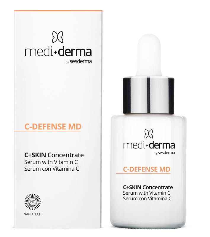 Mediderma C-DEFENCE MD C+SKIN Concentrate serum liposomowe dzięki swojemu składowi jest w stanie odwrócić szkodliwy wpływ wolnych rodników oraz naprawić uszkodzenia. Jego działanie ochronne wynika z synergii składników aktywnych, które wspierają naturalne procesy obronne skóry, cofają widoczne uszkodzenia (zmarszczki, odwodnienie, utrata blasku i napięcia) oraz chronią przez zewnętrznymi czynnikami. Skorzysta na nim w szczególności skóra z widocznymi oznakami uszkodzeń oksydacyjnych: zmarszczkami, odwodnieniem, brakiem blasku i jędrności.