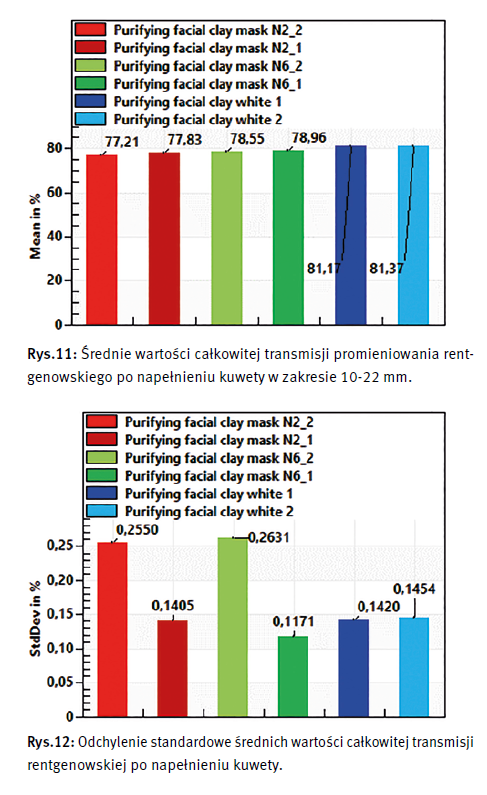 Porównując wartości średnie (Rys.11) i biorąc pod uwagę odchylenie standardowe wartości średnich (Rys.12), maseczka z białej glinki wy-kazuje znacznie wyższą średnią transmisję promieniowania rentgenowskiego (81,17% i 81,37%) niż maseczki zielona i czerwona, tj. stężenie składników tłumiących promienio-wanie rentgenowskie jest tu niższe niż w ma-seczkach zielonych i czerwonych.