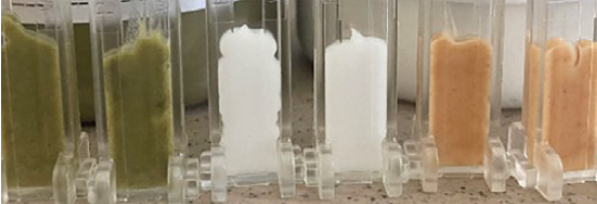 Na potrzeby studium przypadku, zgodnie z wymaganiami klienta, zbadano trzy różne oczyszczające glinki do twarzy. Kolory substancji były zbliżone do zielonego (nr 6), białego (w środku) i czerwonego (nr 2), patrz Rys.1.