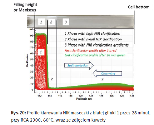 Profile klarowania NIR dla trzech próbek (Rys. 13-18) uzyskane podczas przyspieszonej separacji przy wyższej grawitacji RCA 2300 i podwyższonej temperaturze 60°C pokazują znaczne klarowanie rozpoczynające się na wysokości napełnienia. Cząstki o większej gęstości niż ciekła faza ciągła, tj. minerały i pigmenty nieorganiczne w zależności od składu, opuszczają ten obszar i przemieszczają się w kierunku dna kuwety, ulegając sedymentacji.