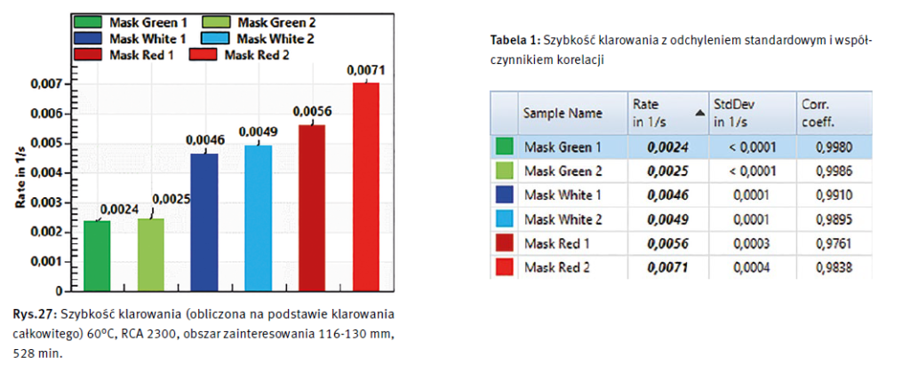 Kinetykę procesów separacji po 5 minutach można określić ilościowo za pomocą modułu „integral clarification“ dostępnego w oprogramowaniu SEPView. Obszar pod każdą krzywą klarowania jest obliczany i wyświetlany jako funkcja odpowiedniego czasu profilu klarowania. Za pomocą regresji liniowej obliczane jest nachylenie, którego wynikiem jest szybkość klarowania w [1/s], jak pokazano na Rys.27 oraz w Tabeli 1.