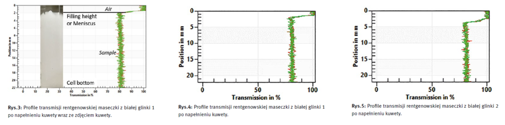 Rys.3 pokazuje na przykładzie białej maseczki 1, jak odczytywać profile transmisji rentgenowskiej. Profile transmisji promieniowania rentgenowskiego po napełnieniu kuwet pokazują stały sygnał od góry do dna kuwety na wysokości 22 mm dla białej glinianej maseczki w dwóch egzemplarzach (Rys.4, 5).