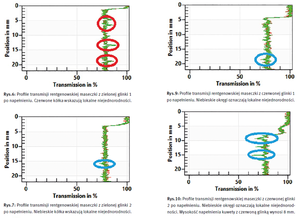 Miejsca wyższej transmisji promieniowania rentgenowskiego, zaznaczone na czerwono, mogą wynikać z niższego lokalnego stężenia składników tłumiących to promieniowanie, np. kaolinu lub montmorylonitu, ale mogą również wynikać z obecności lokalnych pęcherzyków powietrza, gdy próbka posiada wyższą lepkość. W badanych próbkach gołym okiem nie dało się zauważyć pęcherzyków powietrza.