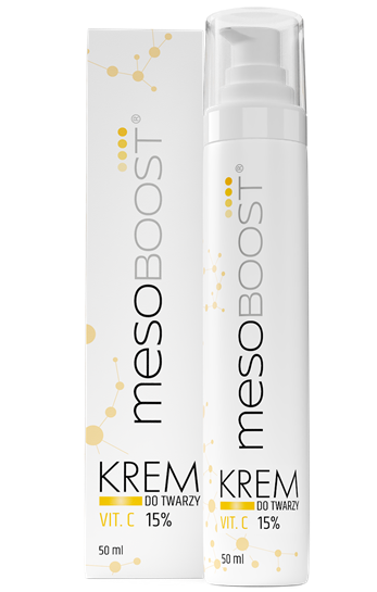 mesoBoost wit. C 15% krem do twarzy to silnie odżywczy i rewitalizujący preparat z witaminą C do codziennej pielęgnacji skóry szarej, matowej, cery palaczy, o nierównym kolorycie oraz zniszczonej słońcem lub upływem lat. Skoncentrowana oraz ustabilizowana witamina C stymuluje procesy odnowy komórkowej i uczestniczy w syntezie elastyny oraz kolagenu. Tym samym intensywnie wpływa na ujędrnienie skóry i wygładzenie zmarszczek. Dodatkowo hamuje i regeneruje uszkodzenia cery powodowane promieniowaniem UV. Specjalnie opracowany kompleks regenerujący, bazujący na oleju lnianym i oleju z czarnuszki pobudza skórę do odnowy i opóźnia procesy starzenia komórek skóry.
