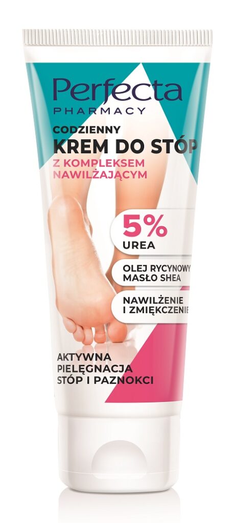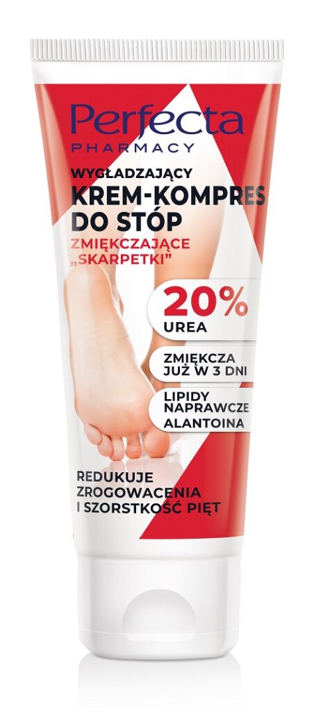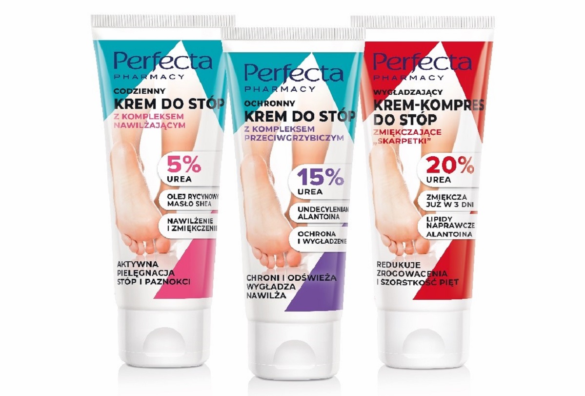 Nawet jeśli regularnie wykonujesz profesjonalny pedicure, to między kolejnymi sesjami skóra stóp potrzebuje pielęgnacyjnego wsparcia. Szczególnie na piętach, które „noszą” cały nasz ciężar. W tej okolicy naskórek szybko staje się twardy i szorstki. W linii Perfecta Pharmacy znajdziemy: Codzienny krem do stóp z kompleksem nawilżającym 5% urea, Ochronny krem do stóp z kompleksem przeciwgrzybiczym 15% urea oraz Wygładzający krem-kompres do stóp zmiękczające ,,skarpetki” 20% urea. W każdym z produktów wykorzystano mocznik (urea) w różnych stężeniach. Jego zadaniem jest głębokie nawilżenie i zmiękczenie martwego naskórka. Skutecznie eliminuje szorstkość i suchość stóp. Latem warto sięgać po kremy o działaniu przeciwgrzybicznym – zwłaszcza, gdy korzystamy z basenu lub często jesteśmy na siłowni. Ratunkiem dla skóry z tendencją do rogowacenia będzie krem-kompres, który działa niczym pielęgnacyjne skarpetki dla stóp.