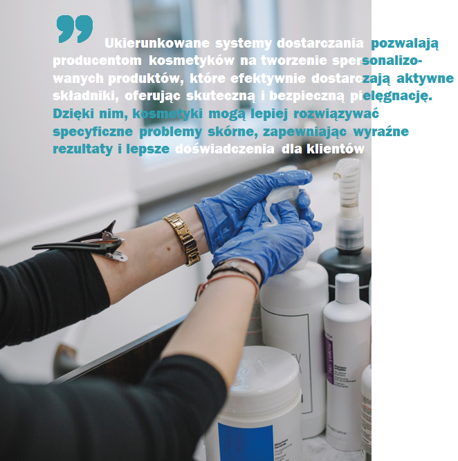 Istnieje kilka rodzajów ukierunkowanych systemów dostarczania, powszechnie stosowanych w kosmetykach, w tym m.in. liposomy. Liposomy to kuliste pęcherzyki złożone z dwuwarstw lipidowych, podobne do struktury błon komórkowych. Umożliwiają, kapsułkowanie hydrofilowych i hydrofobowych składników aktywnych. Liposomy wspomagają penetrację bariery skórnej i dostarczają substancje aktywne do określonych warstw naskórka lub skóry właściwej. Nośniki te zapewniają kontrolowane uwalnianie składników aktywnych, poprawiając ich stabilność i biodostępność.