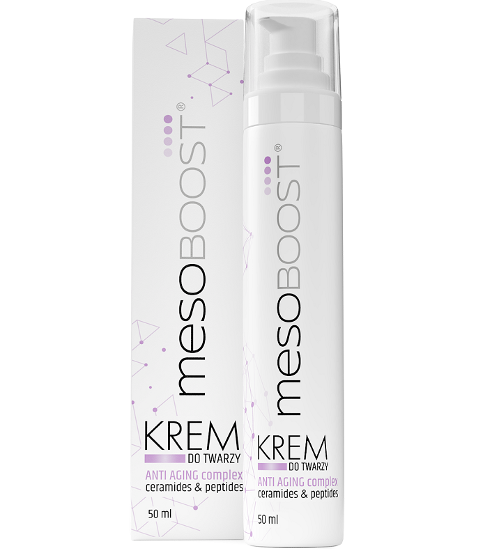Krem do twarzy mesoBoost® ANTI AGING complex ceramides & peptides to kombinacja składników aktywnych o działaniu anti-age. Ceramidy wzmacniają barierę ochronną skóry, chronią przed odwodnieniem i przesuszeniem, a także wykazują działanie przeciwzmarszczkowe i ujędrniające. Peptydy z kolei promują aktywację procesu regeneracji i korzystnie wpływają na odmłodzenie skóry.