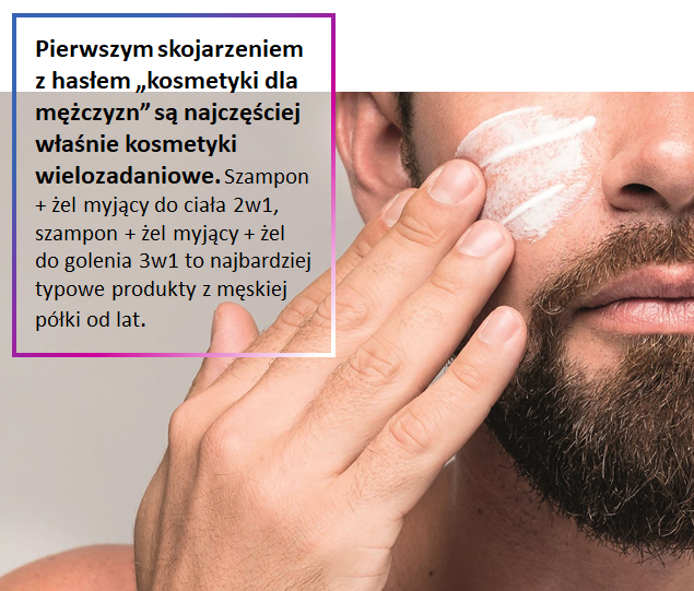 Pierwszym skojarzeniem z hasłem „kosmetyki dla mężczyzn” są najczęściej właśnie kosmetyki wielozadaniowe. Szampon + żel myjący do ciała 2w1, szampon + żel myjący + żel do golenia 3w1 to najbardziej typowe produkty z męskiej półki od lat. Czy nadal takie produkty są przez mężczyzn poszukiwane? Wszystko zależy od grupy wiekowej konsumentów – starsi konsumenci nadal przedkładają wielofunkcyjne produkty nad te skierowane na indywidualne potrzeby skóry czy włosów. Natomiast wśród młodszych grup klientów drogerii wyraźnie widać inny trend – poszukują oni produktów skierowanych do konkretnego typu skóry czy na konkretny problem z włosami, zwracają większą uwagę na składy produktów. Oczywiście wciąż trudno oczekiwać od mężczyzn (a także wielu kobiet w dzisiejszym zabieganym świecie), że będą oni zainteresowani wieloetapową rutyną pielęgnacyjną do stosowania każdego dnia. Nadal liczy się przede wszystkim efektywność, ale można zauważyć, że skład kosmetyków zaczął mieć dla mężczyzn większe znaczenie niż jeszcze dekadę temu.