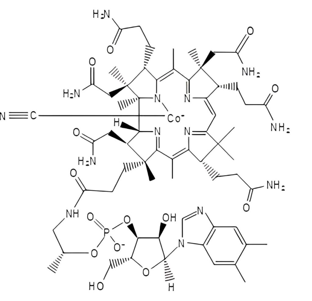 W środowisku naturalnym, witamina B12 występuje głównie jako deoksyadenozylokobalamina i metylokobalamina, z których obie wykazują znaczną niestabilność pod wpływem światła. Na rys. 1. przedstawiono wzór cyjanokobalaminy, będącej formą syntetyczną i najbardziej stabilną [2,5]. Z chemicznego punktu widzenia, witamina B12 to związek kompleksowy z grupy korynoidów, zawierający w swojej strukturze makrocykliczny układ korynowy. Posiada cztery zredukowane pierścienie pirolowe oraz centralny atom kobaltu, występujący na +III stopniu utlenienia. Kobalt otoczony jest sześcioma ligandami: atomem azotu z każdego z czterech pierścieni pirolowych, azotem z 5,6-dimetylobenzimidazolu połączonym z resztą rybozy oraz grupą ortofosforanową. W strukturze występuje również łatwo wymienny ligand β. W przypadku cyjanokobalaminy, ligandem β jest grupa cyjanowa, natomiast grupa hydroksylowa, metylowa i 5’-deoksyadenozylowa, dają odpowiednio: hydroksykobalaminę, metylokobalaminę i adenozylokobalaminę. Witamina B12 jest obecnie produkowana na dużą skalę poprzez fermentację [4].