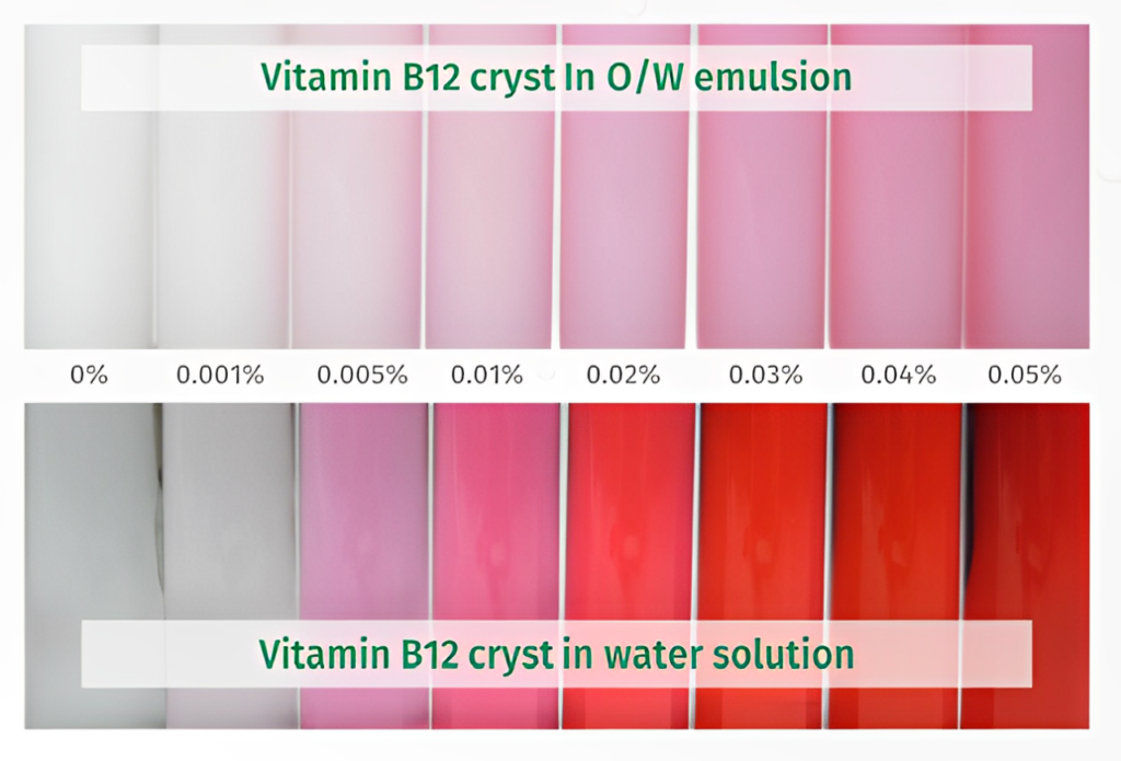 Choć jej działanie na organizm od dawna jest doceniane w kontekście zdrowia, coraz większe zainteresowanie budzi jej potencjał w pielęgnacji skóry. W ostatnich latach witamina B12 zaczyna pojawiać się w składach kosmetyków, w których pełni funkcje nie tylko nawilżające i regenerujące, ale także wspomagające walkę z problemami skórnymi, takimi jak atopowe zapalenie skóry czy przebarwienia. Cyjanokobalamina występuje w postaci krystalicznego, ciemnoczerwonego proszku, rozpuszcza się w wodzie i znajduje zastosowanie w różnego rodzaju produktach – zarówno typu leave-on, jak i rinse-off. Jest wrażliwa na bezpośrednią ekspozycję słoneczną oraz wysoką temperaturę przechowywania – podczas recepturowania warto pamiętać o dodatku substancji chelatującej, takiej jak EDTA, czy glukonian sodu. W technologii produkcji emulsji, może być dodawana zarówno do fazy wodnej, jak i na końcu procesu, a rekomendowane pH produktu gotowego, powinno mieścić się w zakresie 3,5-7,5 [6]. Dzięki obecności cyjanokobalaminy w formulacji kosmetyku, już przy niewielkim dozowaniu (0,001%- 0,1%), możemy uzyskać barwę od jasno-różowej, po krwisto-czerwoną. Ostateczny kolor produktu kosmetycznego, zależny jest również od rodzaju bazy, a porównanie odcieni w roztworze i emulsji przy takim samym stężeniu witaminy B12, przedstawiono na rys. 2.